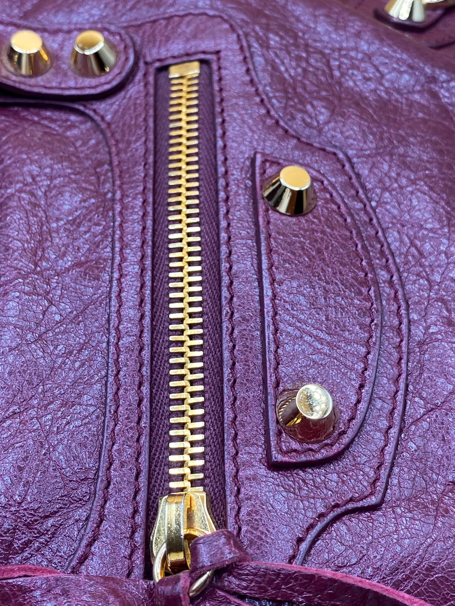 Crafted from Balenciaga's signature Aged Lambskin, it boasts that coveted, perfectly crinkled texture that screams effortless cool and feels incredibly supple. The deep, captivating Prune hue is pure mood—a sophisticated plum-red that adds a fearless edge to any look. Anchoring its rebellious spirit are the bold Giant 12 Gold Hardware studs, delivering a definitive rock-chic punch. Designed for life in motion, the City bag fuses a surprisingly spacious interior with iconic braided handles and a versatile shoulder strap. It's the ultimate fusion of luxury grit and high-fashion swagger, demanding attention wherever it goes.