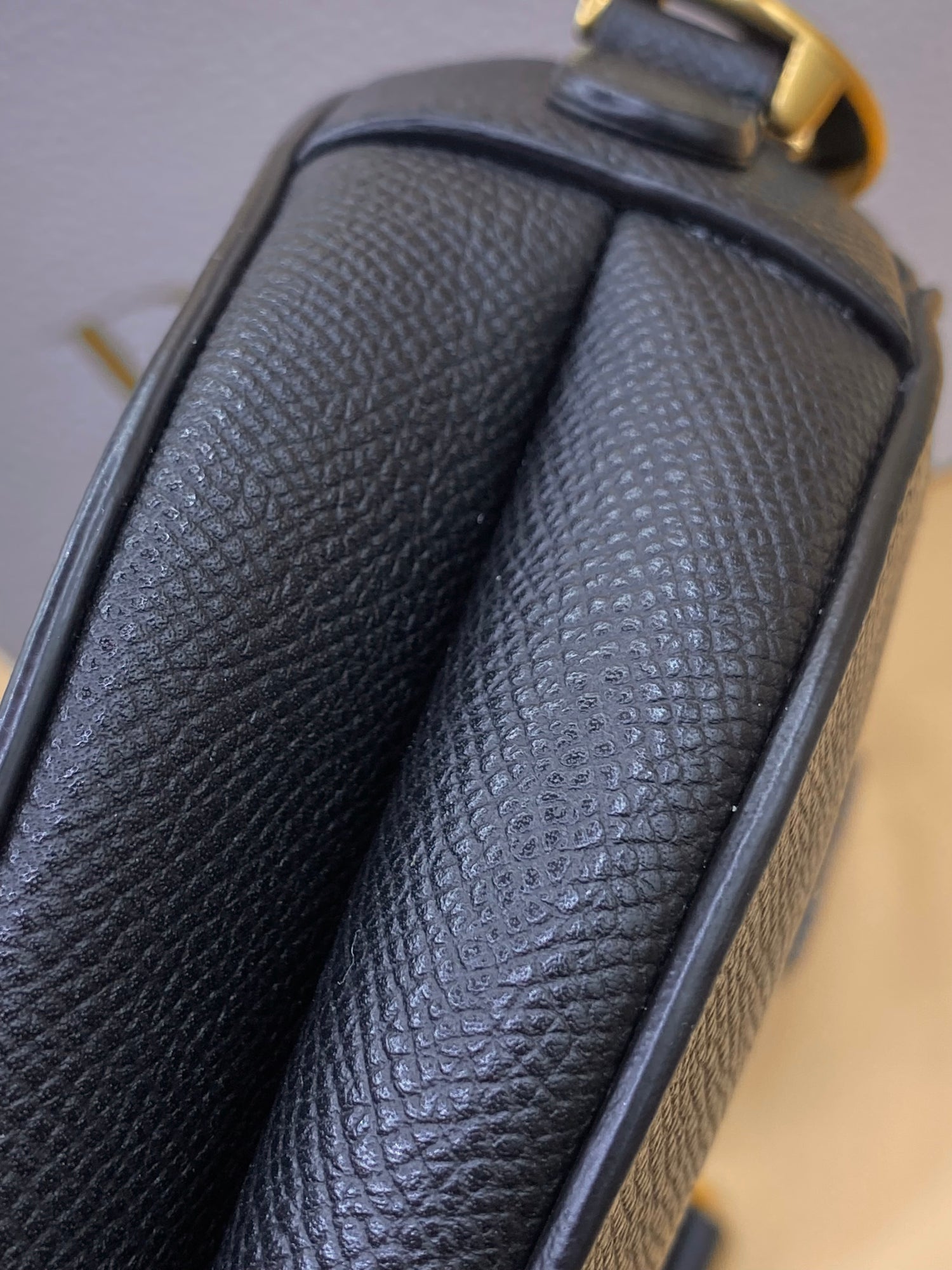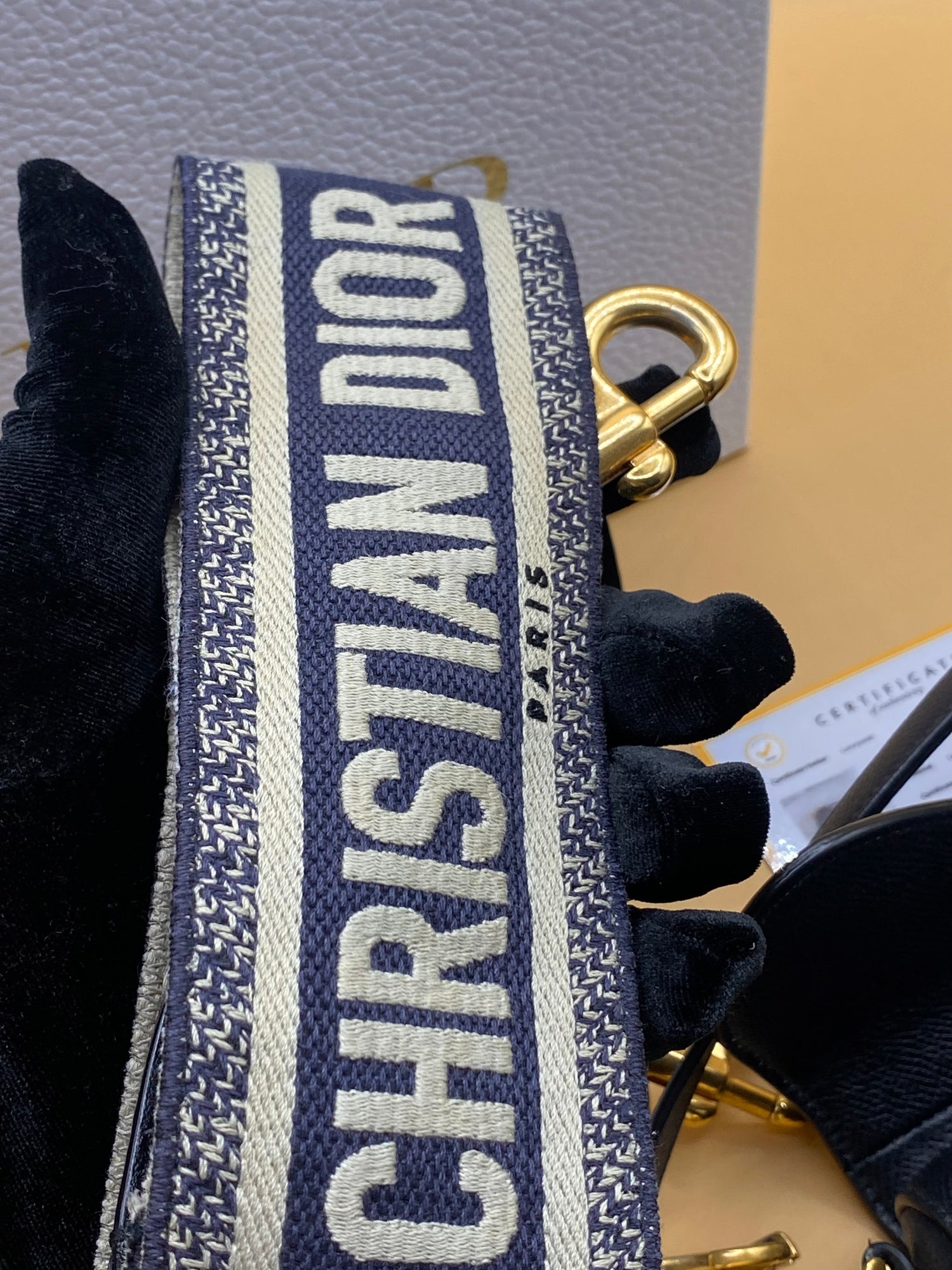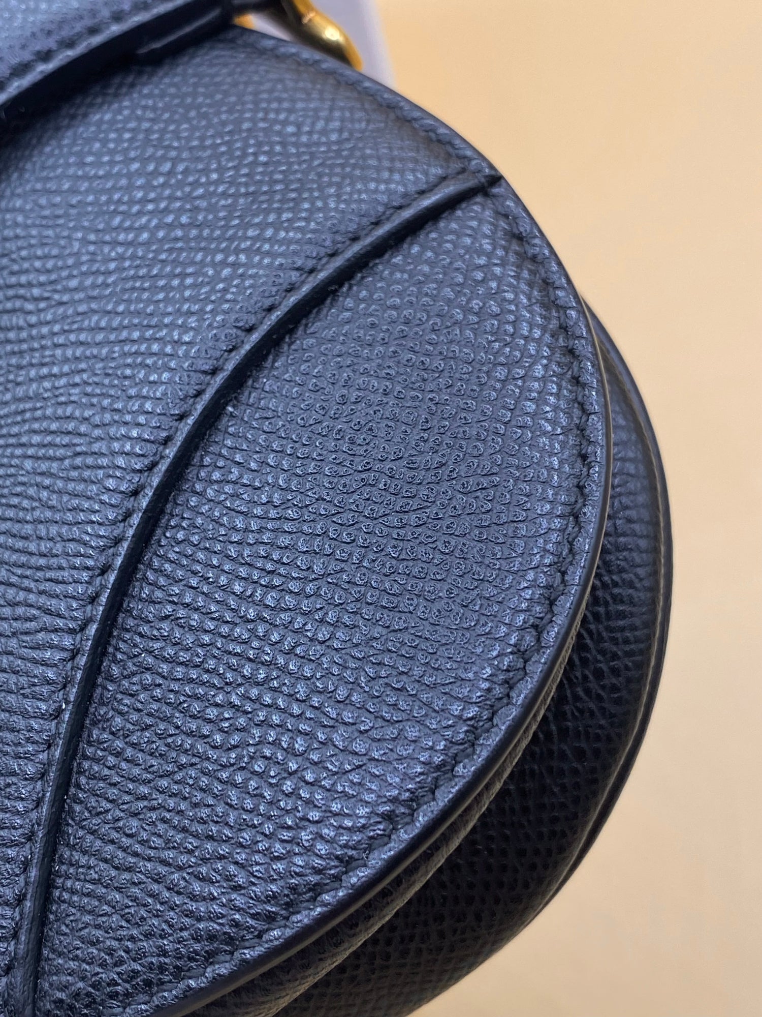 That iconic curve. That bold strap. Game over. This is the Christian Dior Mini Saddle Bag in black grained calfskin. It's pure statement, refined. Glimmering gold-finish hardware amplifies its legendary curves, with the signature 'D' stirrup demanding attention. This isn't just a bag; it's a style powerhouse. It arrives with its sleek leather strap for understated chic, plus the iconic embroidered "Christian Dior" strap for maximum impact and versatility.